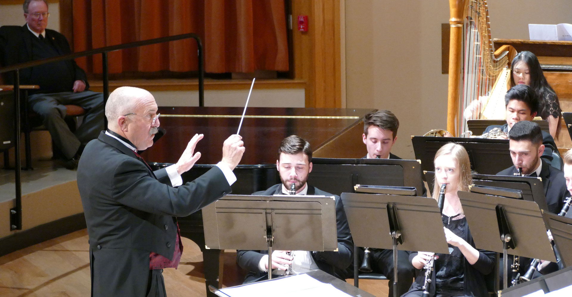 Dr. Lawrence R. Sutherland served as guest conductor for Symphony for Band, Op. 69, II. Adagio Sostenuto, “Round me Falls the Night” — the second piece performed by the Fresno State Wind Orchestra.