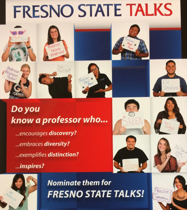 Read MoreWhich professors inspire you? Nominate them for Fresno State Talks, so the entire university community can share in that inspiration. In its fifth year, Fresno State Talks is a student-selected lecture series that features outstanding faculty who exemplify the University’s values of Discoveries, Diversity and Distinction. Faculty nominations are currently being accepted and are due to USU Room […]